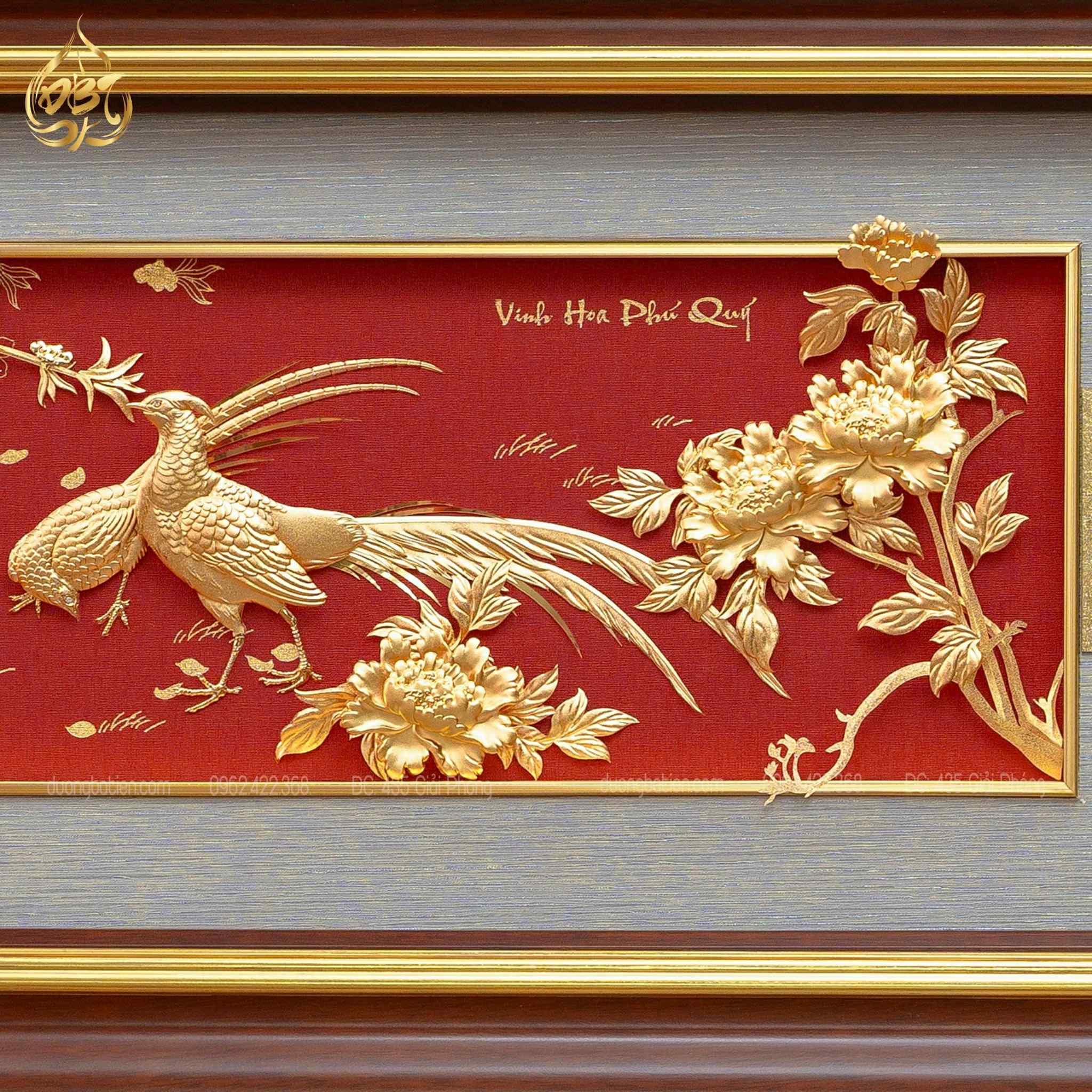 Sản phẩm được chế tác từ vàng thật 24K, áp dụng công nghệ mạ vàng tiên tiến giúp từng chi tiết trở nên sắc nét và bền màu theo thời gian. Đôi chim công được bố trí hài hòa trên nền hoa mẫu đơn hoặc họa tiết sang trọng, thể hiện sự quyền quý và vương giả.